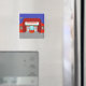 The stars are out in full force on this Retro Movie Theatre Magnet--both the stars in the night sky and the stars on the silver screen. This 1960's style, minimalist art design features the exterior of a classic movie house from the Golden Age of Cinema. The red building has a brilliantly lit marquee, which says, "NOW SHOWING," in red letters. Beneath the marquee, a theatre employee is ready for a crowd of movie going film buffs, which are sure to be lining up in droves. The silhouette of the clean cut, theatre worker is just visible through the aqua glass of the box office ticket booth. Not a kernel of popcorn can be found on the spotless grey sidewalk. Grey double doors flank the ticket booth. The front of the building displays black and white movie posters surrounded by dramatically lit frames. One poster shows star crossed lovers in a dramatic scene and the other shows a swimsuit clad starlet whose career is as bright as the sun she worships. This product is from the brilliant minds at Zazzle's StrangeLittleOnion, who have brought you such cult classics as Retro Pool Party, Film Noir Martini and Retro Space Age Cartoon Couple. Critics agree; if you can only purchase one design this season, make it this one (or any of the other spectacular StrangeLittleOnion designs)!