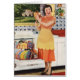 A retro 1950s housewife and mother stands in her dress, high heels and apron before the open dishwasher in her kitchen holding up a copper pan that's clean and shining brightly. Inside the card it says, "I like hugs and I like kisses, but what I really love is help with the dishes."