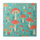 Blue and orange tiles with an illustration of retro mushrooms in vintage colours.