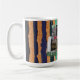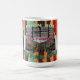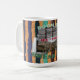 Retro music mug, Cassette tapes and tower blocks, with a boom box ,when pirate radio was the only way of breaking out. A homage to the stations in a vintage style. All original art overlaid, fused over a recent painting.