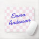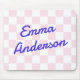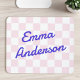 Mousepad featuring your name in blue a blue, retro style font over a pale pink and white chequerboard pattern.