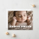 White or any colour thank you birth announcement notecard with the baby's name in a retro style font over your photo with the date of birth below. Customisable message on the back. You can change all colours, move and resize elements with the design tool.
