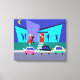 This Retro Open House Party Stretched Canvas Print will put you in the partying mood. The cartoon design features the exterior of a mid century modern house. Through the floor to ceiling turquoise glass walls, we can see the navy blue silhouettes of festive party goers. There is a couple chatting in front of a window. On the opposite side of the room, we can see a dancing man and the long-winded man everyone is trying to avoid. The exterior of the house features a cheery red door and an oversize purple brick chimney. A grey walkway is cutting a swath to the front door, through the teal grass. The nighttime scene has a dark blue sky with a yellow, crescent moon. An attractive couple is doing the cha-cha-cha on the way to their car. The blonde woman is wearing a bright red dress. Her handsome escort is wearing a black suit and a red tie. His hands are wrapped around the woman's waist. On the street, in front of the house, we can see three, brightly coloured classic cars. Order today and party like it's 1959!