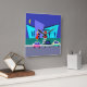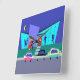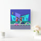 This Retro Open House Party Wall Clock will put you in the partying mood. The cartoon design features the exterior of a mid century modern house. Through the floor to ceiling turquoise glass walls, we can see the navy blue silhouettes of festive party goers. There is a couple chatting in front of a window. On the opposite side of the room, we can see a dancing man and the long-winded man everyone is trying to avoid. The exterior of the house features a cheery red door and an oversize purple brick chimney. A grey walkway is cutting a swath to the front door, through the teal grass. The nighttime scene has a dark blue sky with a yellow, crescent moon. An attractive couple is doing the cha-cha-cha on the way to their car. The blonde woman is wearing a bright red dress. Her handsome escort is wearing a black suit and a red tie. His hands are wrapped around the woman's waist. On the street, in front of the house, we can see three, brightly coloured classic cars. Order today and party like it's 1959!