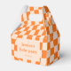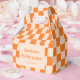 These personalized favor boxes feature a playful retro checker pattern in warm orange with a soft peach center panel for names and event details. Designed to feel fun yet polished, they’re perfect for packaging baby shower favors, sweets, small gifts, or take-home treats. The folded box style makes setup easy while adding a bold pop of color to dessert tables and party displays. Customize the name and date to coordinate seamlessly with matching baby shower decor and party stationery.