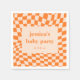 These personalized napkins feature a bold retro checker pattern in warm orange tones with a soft peach center and custom event text. A fun, modern detail for baby showers, this design adds color and personality to drink tables, dessert stations, and place settings. The groovy abstract pattern brings a playful, nostalgic feel while still looking polished and intentional. Personalize the name and date to coordinate seamlessly with the rest of your baby shower decor.