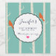 Birthday bottle labels with an illustration of birch trees with orange birds sitting on their branches. Retro green coloured background. Layered over top is a circle with a scalloped shape border, a little heart and your personalised text inside.