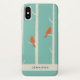 A phone case with an illustration of birch trees with orange birds sitting on their branches. Retro green coloured background.
