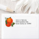 Editable return address labels with a slab font and two ripe oranges on a branch with small white blossoms flowering against green leaves, from vintage crate label artwork.