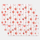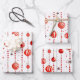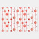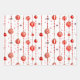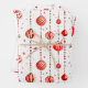 This wrapping paper features a repeating pattern of red and white Christmas ornaments hanging from vertical strings of red beads. There are also small, stylised red stars scattered throughout the white background. Some ornaments are solid red, while others have red and white stripes.