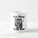 A clean white mug with a retro owl and humor for tired mornings.