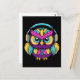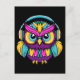 Groovy, multicolored retro owl wearing headphones. This cartoon owl has bright colourful feathers in pink, blue, yellow, turquoise and purple. He is wearing a set of modern funky headphones in yellow and blue.