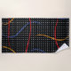 Retro 1980’s style primary colour paint strokes splatter pattern on a geometric black and white dotted background.