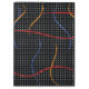 Retro 1980’s style primary colour paint strokes splatter pattern on a geometric black and white dotted background.