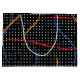 Retro 1980’s style primary colour paint strokes splatter pattern on a geometric black and white dotted background.