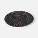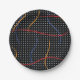 Retro 1980’s style primary colour paint strokes splatter pattern on a geometric black and white dotted background.