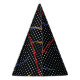 Retro 1980’s style primary colour paint strokes splatter pattern on a geometric black and white dotted background.