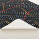 Retro 1980’s style primary colour paint strokes splatter pattern on a geometric black and white dotted background.