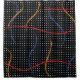 Retro 1980’s style primary colour paint strokes splatter pattern on a geometric black and white dotted background.