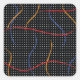 Retro 1980’s style primary colour paint strokes splatter pattern on a geometric black and white dotted background.