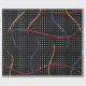 Retro 1980’s style primary colour paint strokes splatter pattern on a geometric black and white dotted background.
