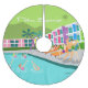 This Retro Palm Springs Hotel Christmas tree skirt is as fabulous as it is kitschy. Its garishly bright rainbow facade is dwarfed by the lime green mountains and spectacularly iconic palm trees. There's a party going on by the pool with bathing beauties and muscle men soaking up some vitamin D while watching the synchronised swimmers perform. It appears that only one of the swimmers knows the routine; the other four are out of sync. How embarrassing for them! The only thing that would make this design say “Palm Springs” more would be if it was written in the clouds. Oh, wait. It is!