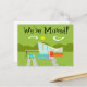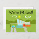 This Retro Palm Springs House with Car Change of Address Postcard is a mid century modern lover’s dream. The minimalist art design features a sleek orange and glass house with a dramatically sloping checkmark shape roof. The red door offsets the orange stone planter filled with greenery and the decorative turquoise cinderblock privacy screen. Staggered concrete blocks form the perfect walkway through the lush, green lawn. A white carport offers shelter to a turquoise and white classic 1950’s car with fins. The car is perfect for driving around the green, rounded mountains in the distance. The kitschy 1960’s style house looks like a shady oasis from the hot, Palm Springs sun. The top this card says, "We've Moved!" in bold, black lettering.