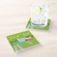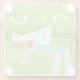 This Retro Palm Springs House with Car Glass Coaster is a mid century modern lover’s dream. The minimalist art design features a sleek orange and glass house with a dramatically sloping checkmark shape roof. The red door offsets the orange stone planter filled with greenery and the decorative turquoise cinderblock privacy screen. Staggered concrete blocks form the perfect walkway through the lush, green lawn. A white carport offers shelter to a turquoise and white classic 1950’s car with fins. The car is perfect for driving around the green, rounded mountains in the distance. The kitschy 1960’s style house looks like a shady oasis from the hot, Palm Springs sun.