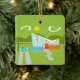 This customisable Retro Palm Springs House with Car Christmas Ornament is a mid century modern lover’s dream. The minimalist art design features a sleek orange and glass house with a dramatically sloping checkmark shape roof. The red door offsets the orange stone planter filled with greenery and the decorative turquoise cinderblock privacy screen. Staggered concrete blocks form the perfect walkway through the lush, green lawn. A white carport offers shelter to a turquoise and white classic 1950’s car with fins. The car is perfect for driving around the green, rounded mountains in the distance. The kitschy 1960’s style house looks like a shady oasis from the hot, Palm Springs sun. The opposite side is green and can be personalised. This makes a great housewarming gift.