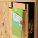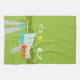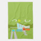 This Retro Palm Springs House with Car Kitchen Towel is a mid century modern lover’s dream. The minimalist art design features a sleek orange and glass house with a dramatically sloping checkmark shape roof. The red door offsets the orange stone planter filled with greenery and the decorative turquoise cinderblock privacy screen. Staggered concrete blocks form the perfect walkway through the lush, green lawn. A white carport offers shelter to a turquoise and white classic 1950’s car with fins. The car is perfect for driving around the green, rounded mountains in the distance. The kitschy 1960’s style house looks like a shady oasis from the hot, Palm Springs sun.