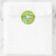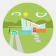 These Retro Palm Springs House with Car Round Stickers are a mid century modern lover’s dream. The minimalist art design features a sleek orange and glass house with a dramatically sloping checkmark shape roof. The red door offsets the orange stone planter filled with greenery and the decorative turquoise cinderblock privacy screen. Staggered concrete blocks form the perfect walkway through the lush, green lawn. A white carport offers shelter to a turquoise and white classic 1950’s car with fins. The car is perfect for driving around the green, rounded mountains in the distance. The kitschy 1960’s style house looks like a shady oasis from the hot, Palm Springs sun.