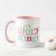 This playful mug features the saying "Glory to the Newborn King" with alternating colours on lowercase letters with sparkle accents. Colours include pink, red, green and light blue.
