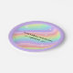 Complete your magical celebration with these trendy Retro Pastel Rainbow party plates! Featuring a dreamy wavy pattern in soft sorbet shades and a stylish lavender purple border, these plates are the perfect addition to a 6th birthday or any 'Groovy' themed party. Personalize easily with your child's name and age for a custom touch that guests will love. High-quality, chic, and designed to make your dessert table shine. Matching invitations and party supplies available in the collection!