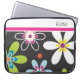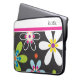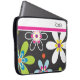 Retro peace signs in orange, green, pink blue and purple on a black background make this laptop sleeve a cool accessory to have .. perfect gift idea for woman or tweenw and teens.