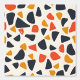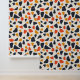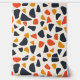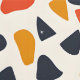 This artwork features a playful and abstract pattern composed of irregular, pebble-like shapes scattered across a cream background. The design uses a warm, retro-inspired colour palette of deep navy, burnt orange, and mustard yellow. The shapes vary in size and orientation, creating a dynamic and spontaneous arrangement that evokes a sense of movement and energy. The simplicity of the forms, combined with the bold colours, gives the pattern a mid-century modern feel, reminiscent of vintage textiles and design.