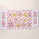 Multi Custom Colour and Font Style - personalised beach towel with name, happy smile face and retro chequered background  and flowers. Customise all colours as you wish! Cool idea for Bridesmaid gift!