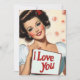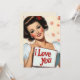 A vibrant illustration in classic 1950s pin-up style. The image features a glamourous woman with vintage curls, bold makeup, and a radiant smile. She holds a sign with a loving message, “I Love You,” set against a backdrop of delicate pink roses. The overall aesthetic captures the romantic and playful vibe of mid-century pin-up art.