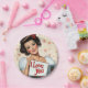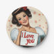 A vibrant illustration in classic 1950s pin-up style. The image features a glamourous woman with vintage curls, bold makeup, and a radiant smile. She holds a sign with a loving message, “I Love You,” set against a backdrop of delicate pink roses. The overall aesthetic captures the romantic and playful vibe of mid-century pin-up art.