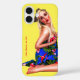 Nostalgic Retro Pinup Girl iPhone 16 case, featuring original pinup artwork ©"Miss Cherrie Au Lait – Beach Girl". With Yellow background. More designs available in my Zazzle store.