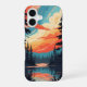 A peaceful retro landscape showing a reflective lake framed by tall pines, created with vintage colors and soft textured details.