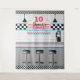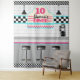 Unique and Fun! Retro Diner Countertop Backdrop with Pink and Blue colours and Chequerboard pattern. Customise with name, age or initial the menu banner. ©2021 Miss Sassy Party Designs