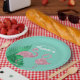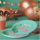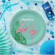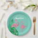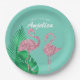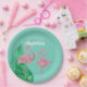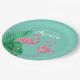 These custom party plates feature a retro style pink flamingo theme. Two pink glitter style flamingos are placed in the bottom portion, with large tropical palm leaves on the left. The background is a beautiful teal colour, with the event title and guest of honour printed in a vintage style white font.