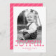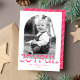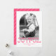 Cute holiday photo card featuring your vertical photo inside of a white arch frame. "Joyful" is displayed in fun, pink retro lettering with your name and the year shown below. The retro Christmas card reverses to display a pink and white diagonal stripe pattern.