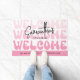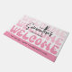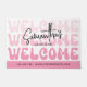 Modern welcome door mat with retro fonts and gradient pink background. The groovy font design reads 'welcome' with trendy script font on top where you can write your name or business name; there is even space for your phone number and website. This trendy floor mat will add a touch of fun and femininity to your hair salon, makeup studio, lash bar, nails spa or any other personal or business space.