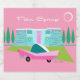 Between the pink background, turquoise mid century modern home, and the classic 1950s car, this design couldn’t be more Palm Springs if it said it in the clouds. Oh, wait, it does say it in the clouds! The blue and teal stone of the house is offset by the sputnik light fixtures framing the hot pink door. This kitschy, retro design welcomes you to live your most fabulous life.