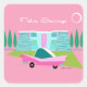 Between the pink background, turquoise mid century modern home, and the classic 1950s car, this design couldn’t be more Palm Springs if it said it in the clouds. Oh, wait, it does say it in the clouds! The blue and teal stone of the house is offset by the sputnik light fixtures framing the hot pink door. This kitschy, retro design welcomes you to live your most fabulous life.
