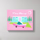 Between the pink background, turquoise mid century modern home, and the classic 1950s car, this design couldn’t be more Palm Springs if it said it in the clouds. Oh, wait, it does say it in the clouds! The blue and teal stone of the house is offset by the sputnik light fixtures framing the hot pink door. This kitschy, retro design welcomes you to live your most fabulous life.