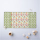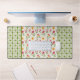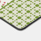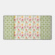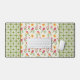 Whimsical retro inspired desk mat features pink birds on branches with yellow flowers, surrounded by green dot grid pattern