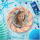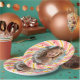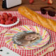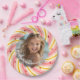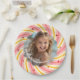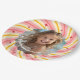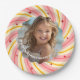 Colourful birthday paper plates featuring your photo and a pink and yellow sunburst with red, retro stars. Customisable text "Happy birthday" and your name.