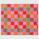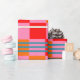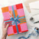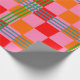 This wrapping paper has a mid-century modern design of red, pink, and orange squares and green and blue lines forming a plaid design.